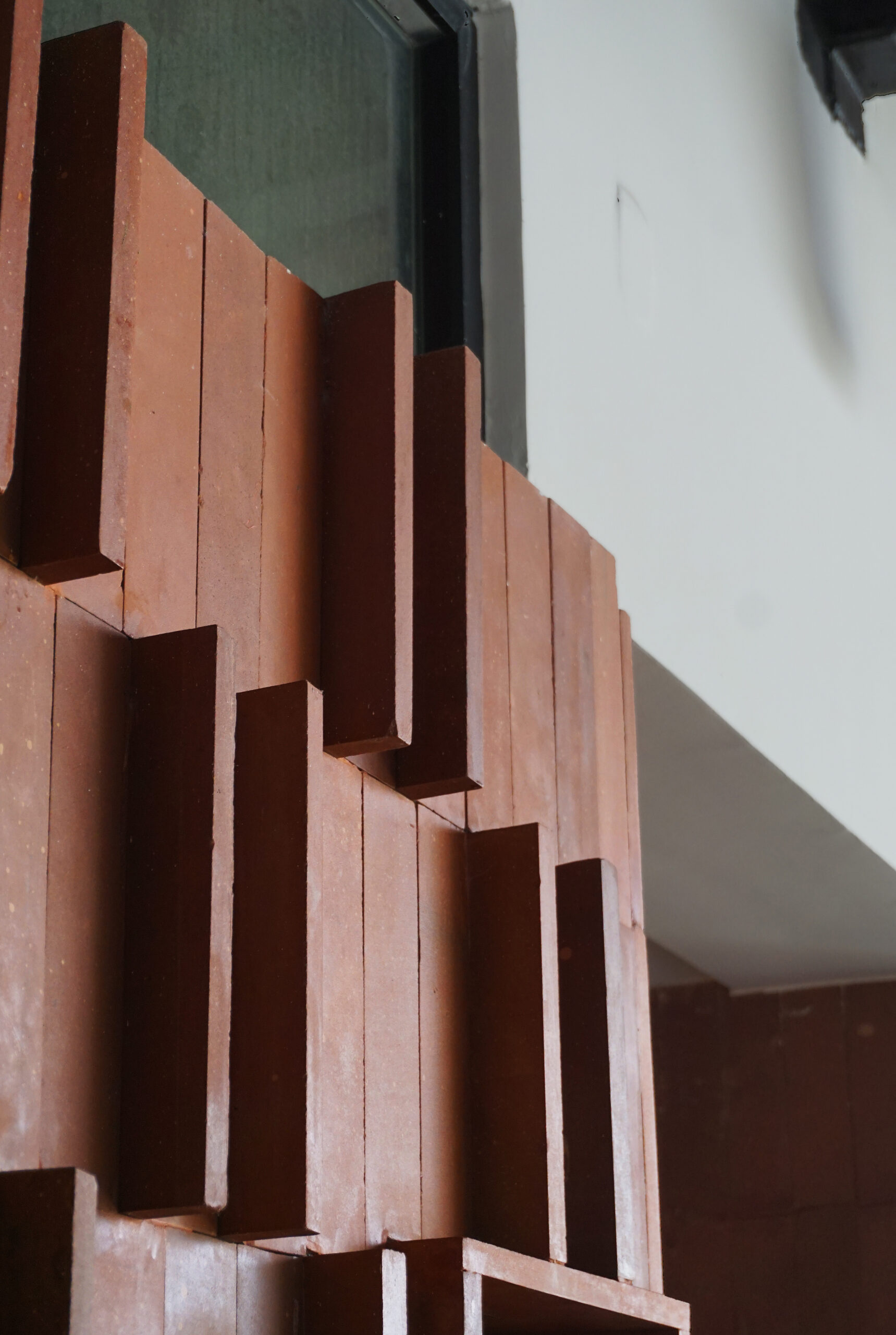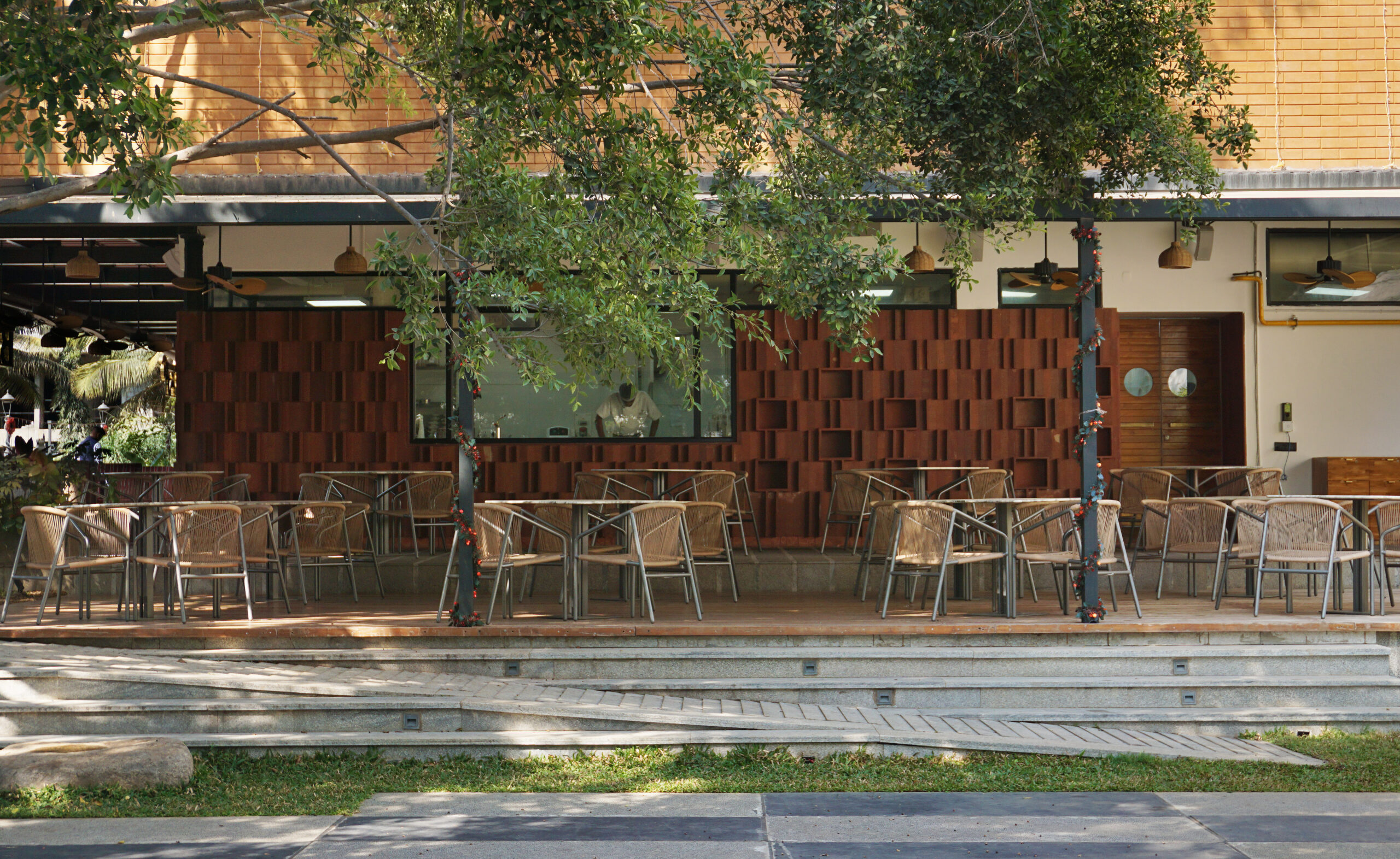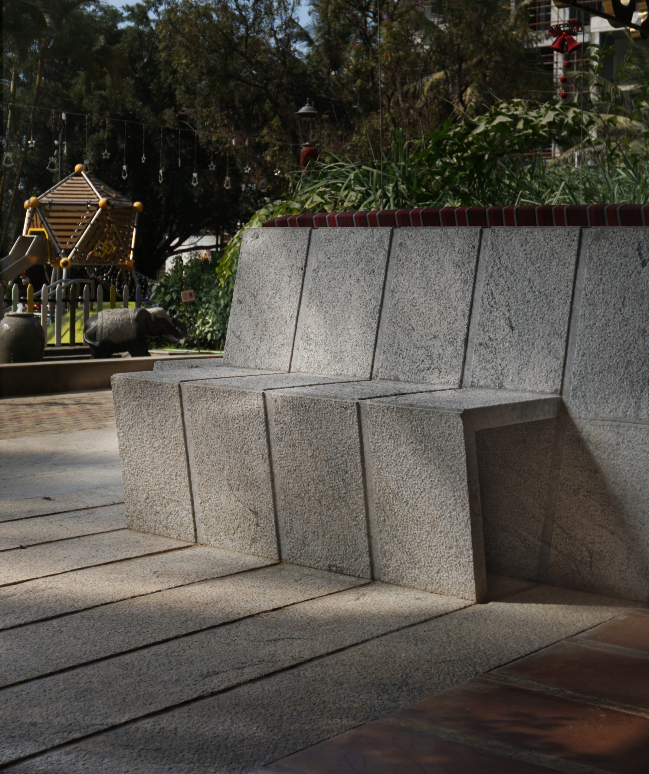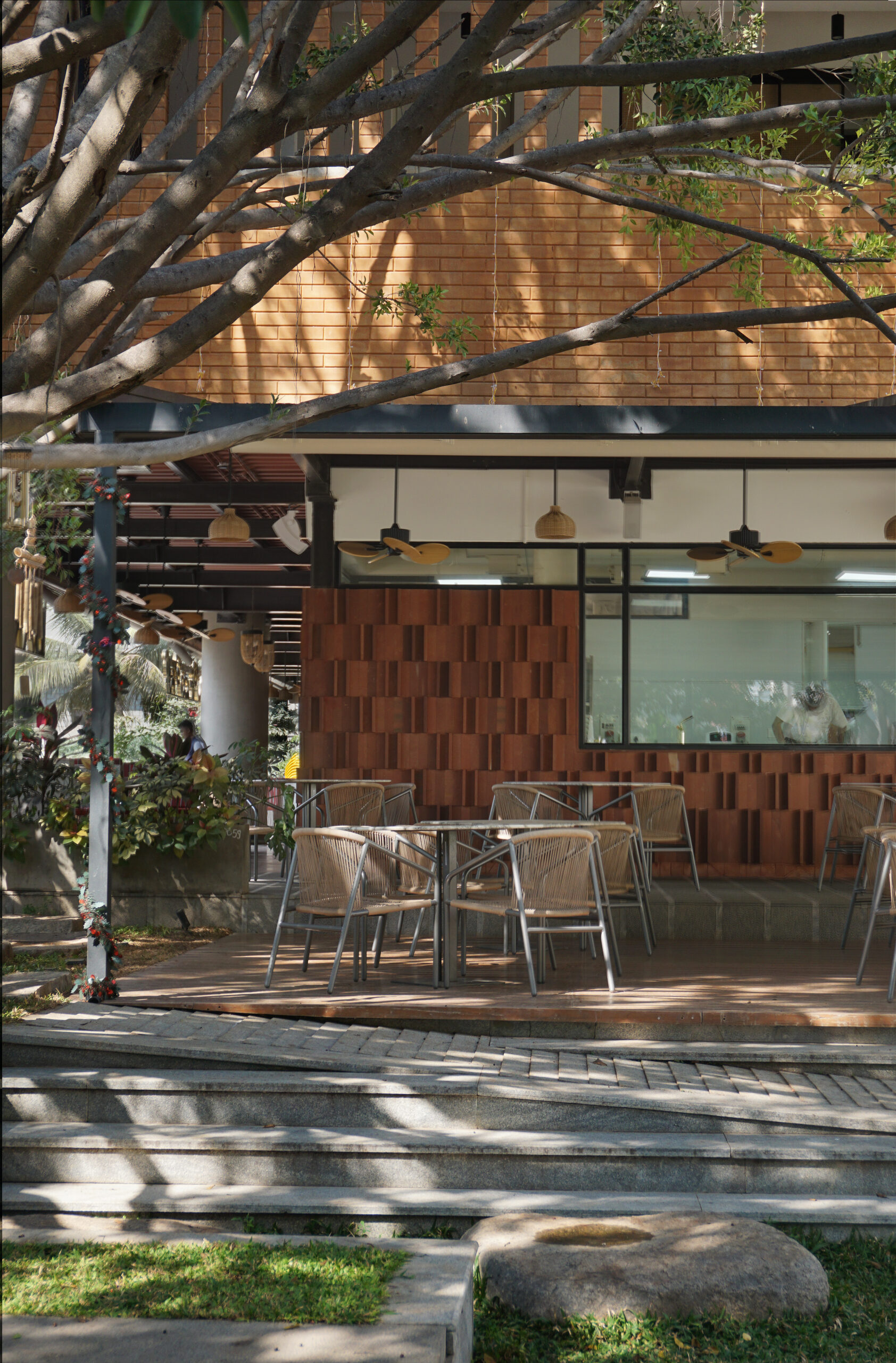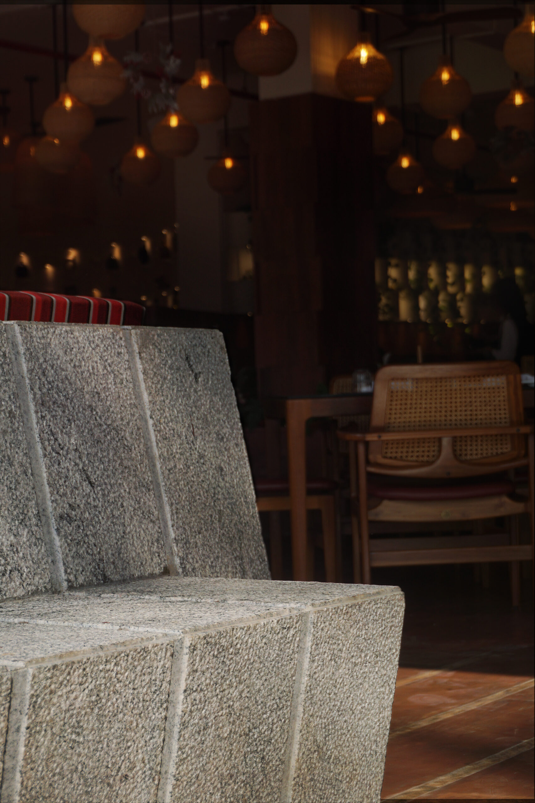 The semi-outdoor alfresco areas are a continuation of the sculpted quality of ramps that are expressed in light and dark granites, with hand crafted textures. When read together with the diner benches, comprising the same materials, they appear as an assembly of strips of granite, rising and falling to create pathways, steps, and benches. Forming the front elevation of the restaurant, it provides an immediate understanding of the core concept of Barnhouse : a contemporary manifestation using age-old wisdom.