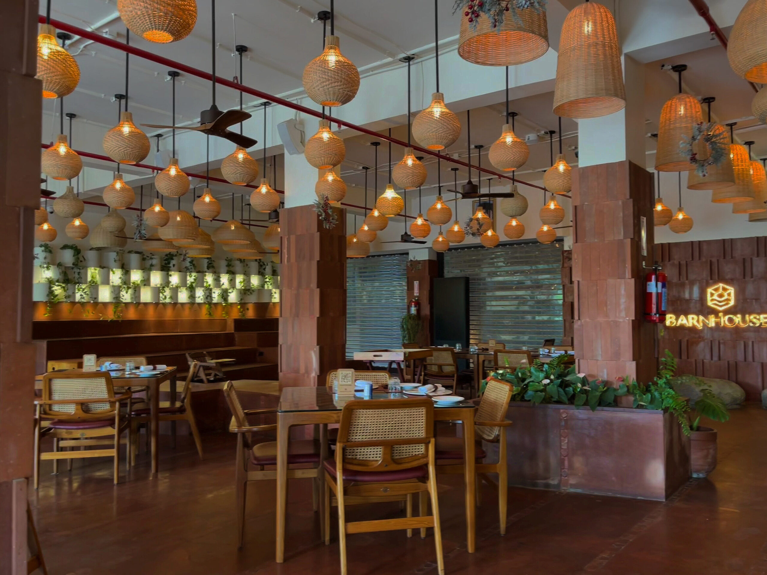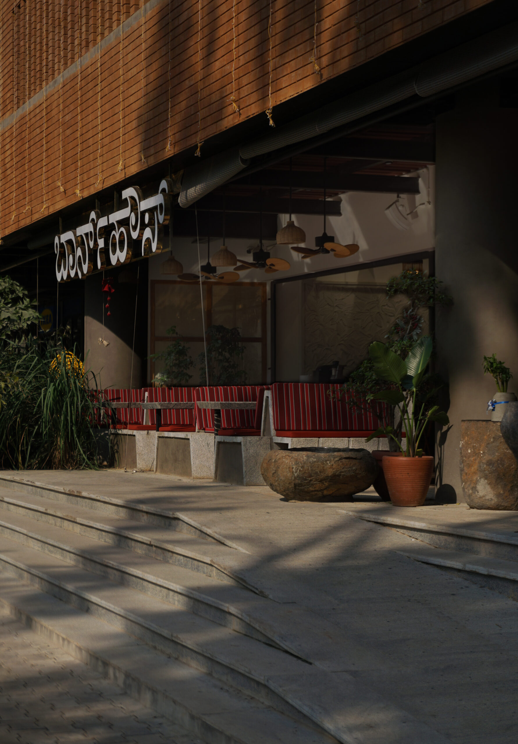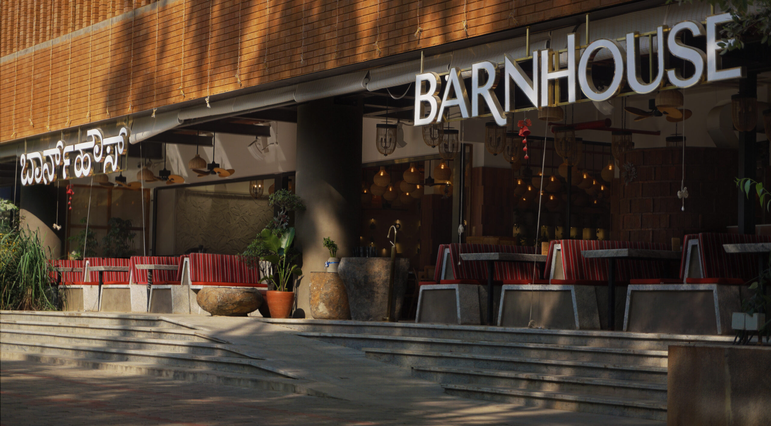 The broad concept of Barnhouse, a restaurant located in Whitefield, Bangalore, is represented as a holistic awareness of food, body, mind, and environment. This is expressed through its key activities: optimised local urban farming through hydroponics, a conscious cuisine made up of locally grown ingredients, interactive social spaces for creative activities, and indoor and outdoor yoga spaces that double up as performance spaces. The design is accordingly based on selecting materials that, being natural and locally sourced, facilitate this programme geared towards an overall wellness of mind, body, and soul.