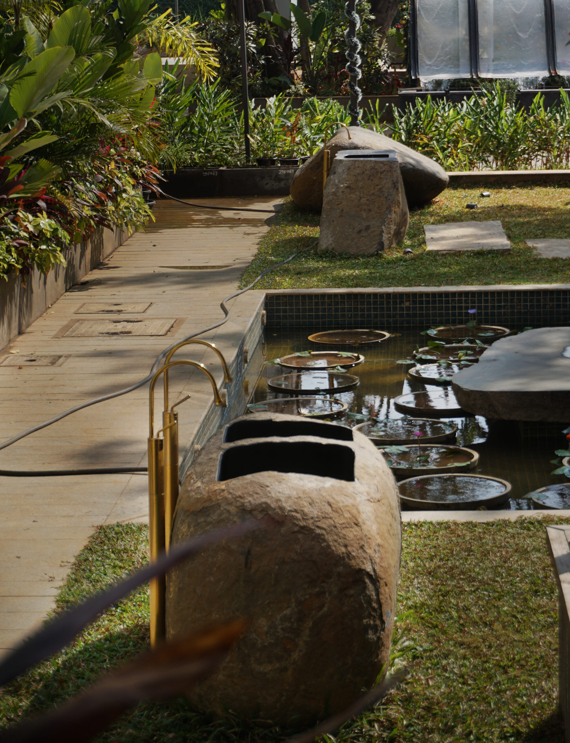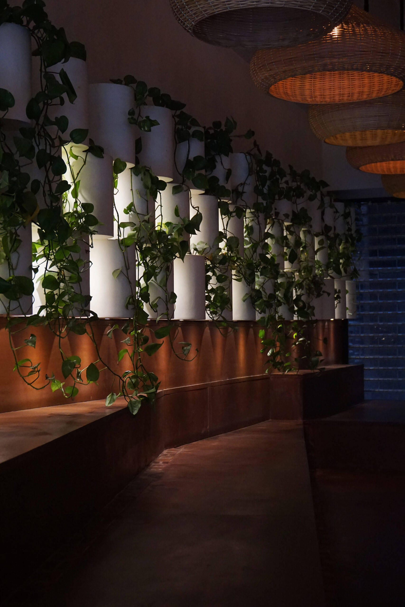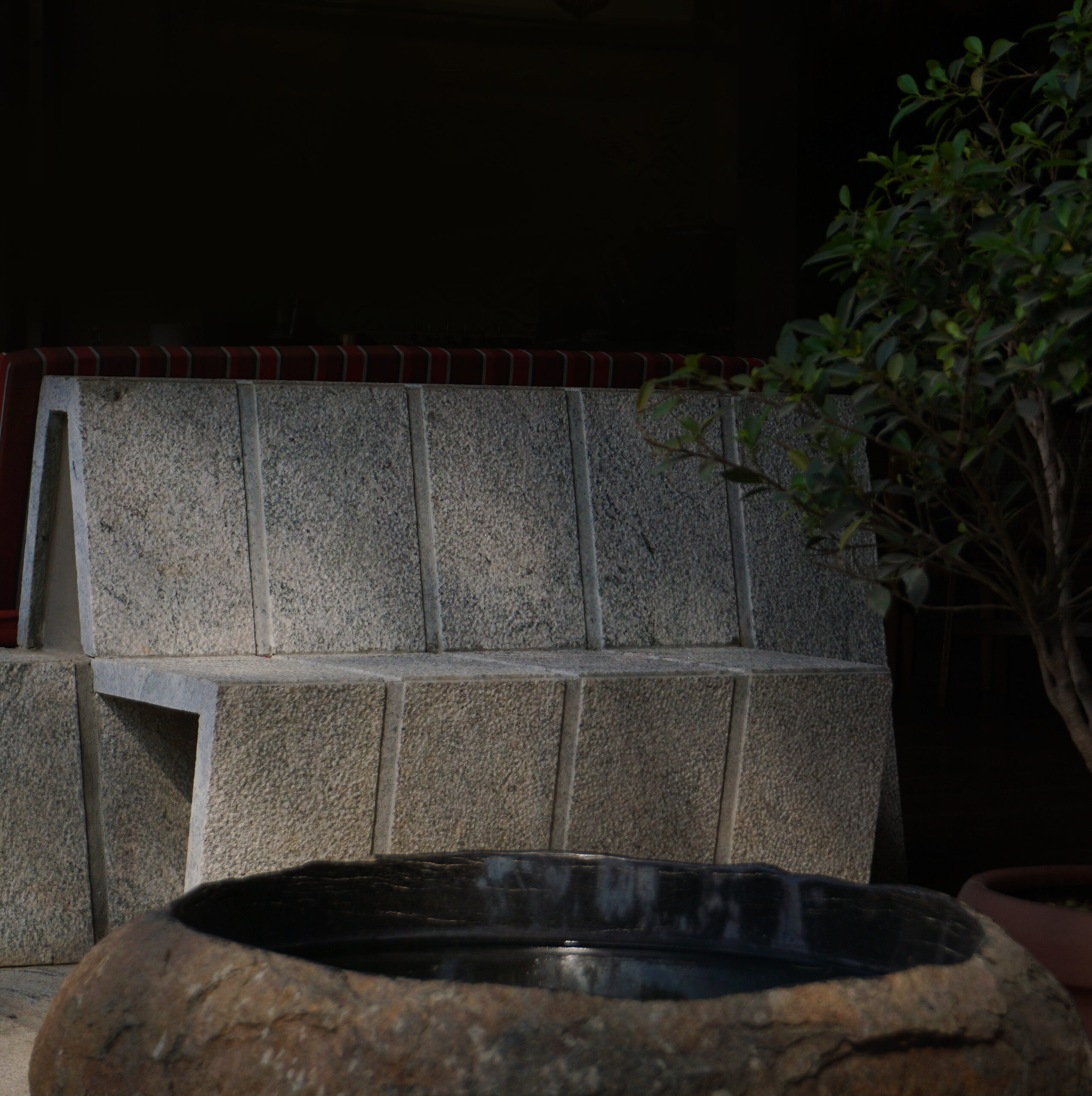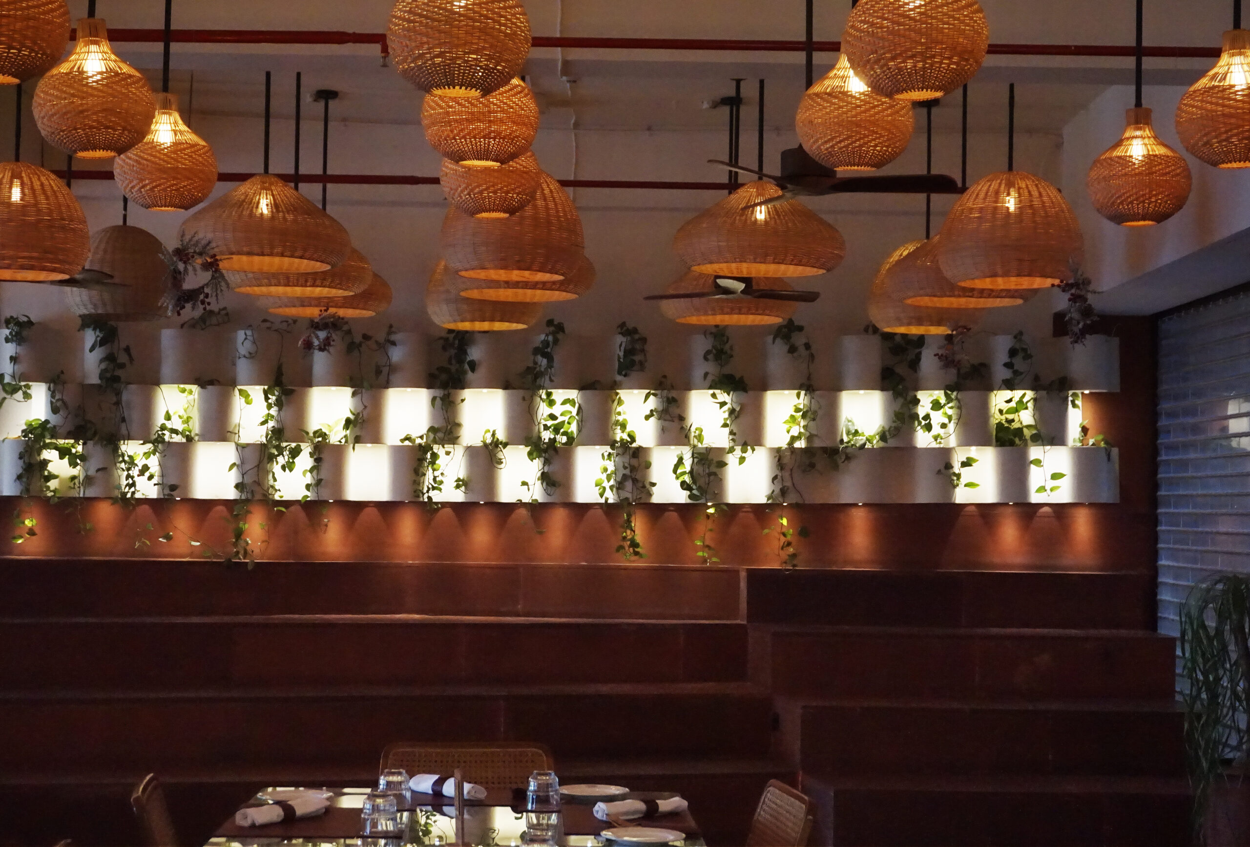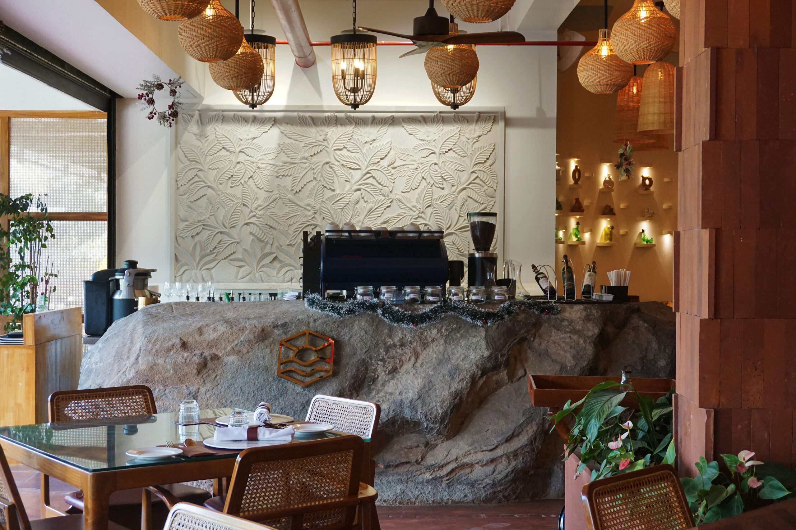 The restaurant also features several rocks and boulders, with minor carvings to enable their use as sinks, basins, including one impressive 3m long rock that serves as a bar counter. The boulders being left in their untreated, rough state, serve to connect patrons to the natural environment that the cuisine of the restaurant is inspired by.