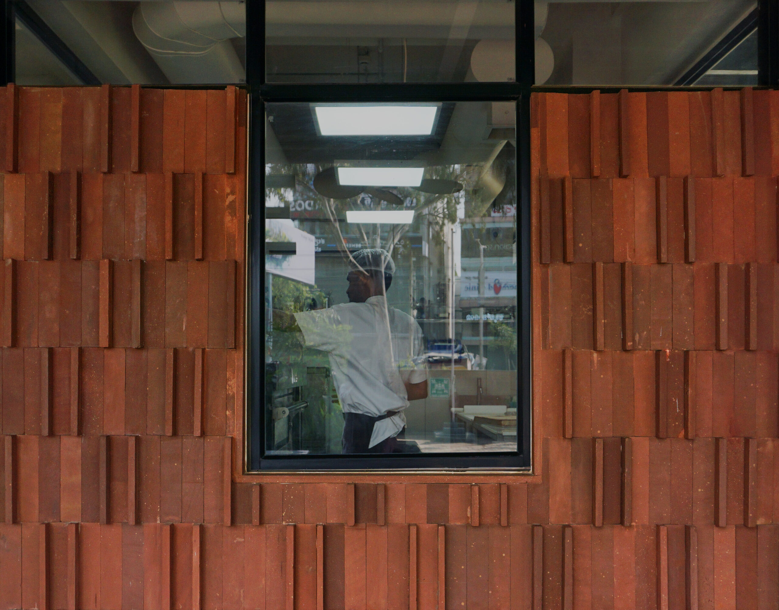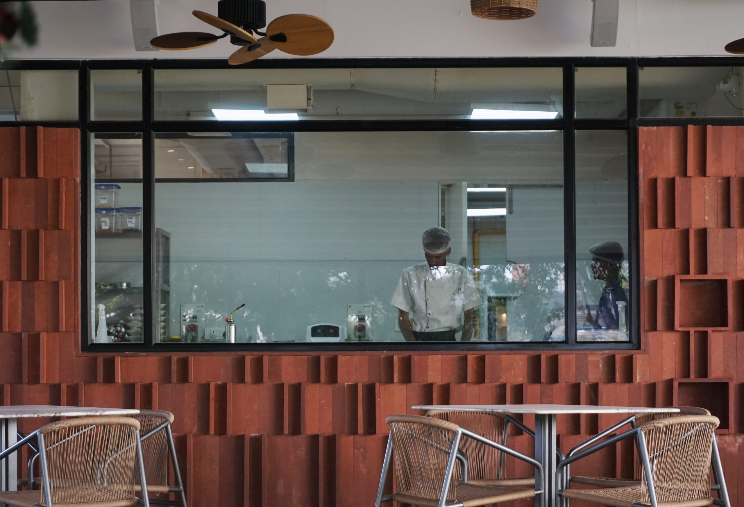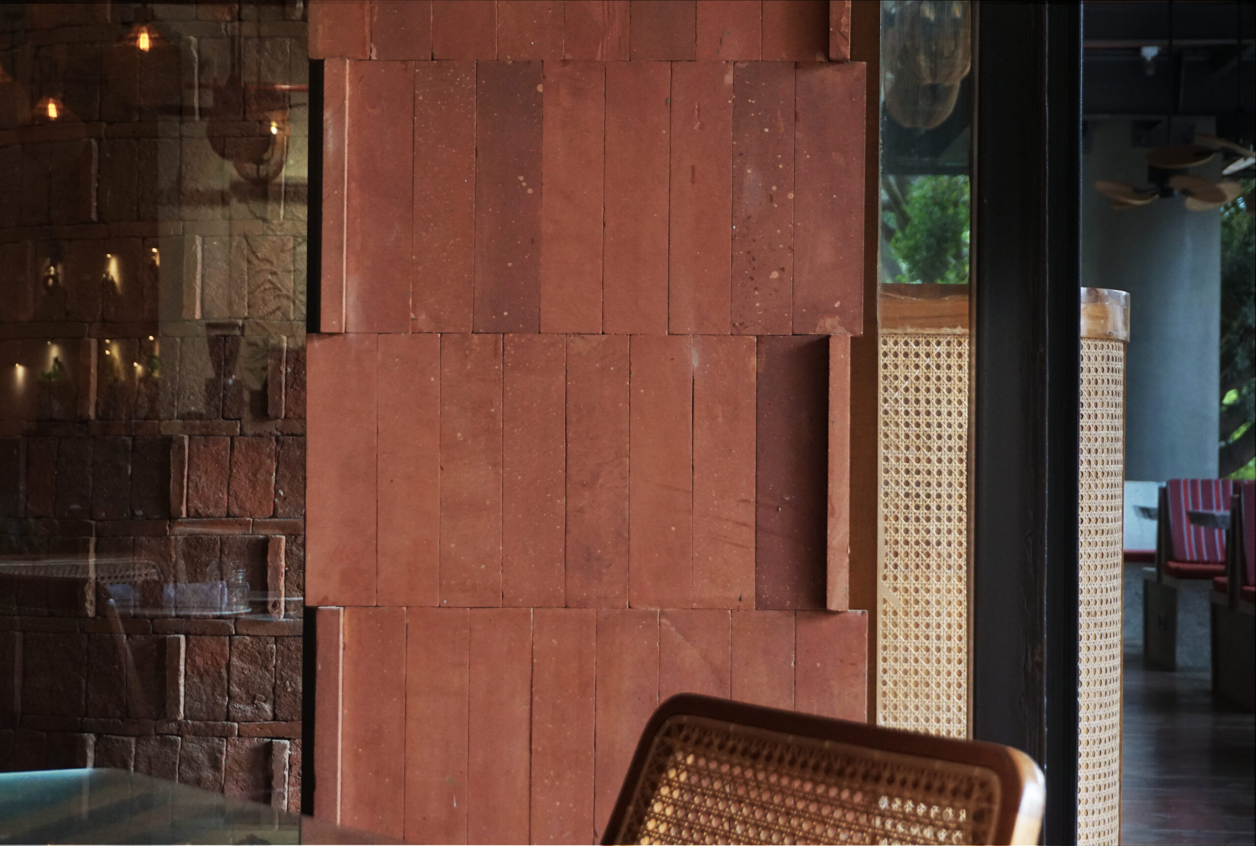 The main floor areas of the restaurant are treated with modern interpretations of the ancient tiles arranged in contemporary patterns. The patterns of the red agra stone on the floor act as orientation lines, guiding and defining circulation, and demarcate the multipurpose nature of flexible furniture arrangements in the space. The red agra stone cladding on the walls similarly utilises age-old materials and craftsmanship, arranged in modern patterns, creating an engaging texture and a human scaled elevation. This pattern is echoed in the pizza bake oven, which features Achakal bricks, an ancient pre-industrial brick. The brick serves to suggest the element of “fire”, drawing parallels between the language of a brick kiln and that of an oven.